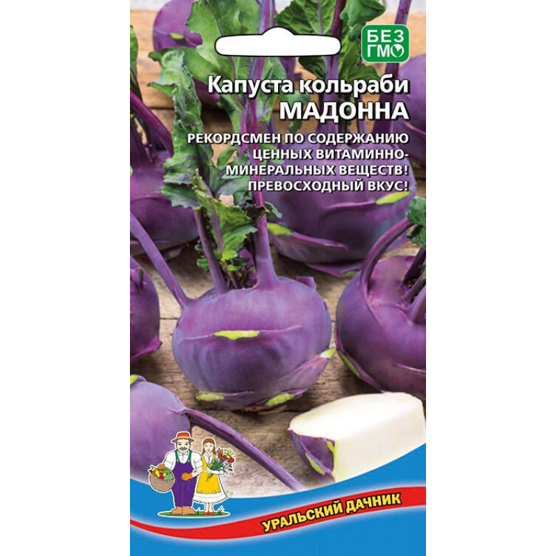 Капуста кольраби МАДОННА - среднеспелый сорт с периодом вегетации 110-130 дней от всходов до уборки урожая. Растение формирует полувертикальную розетку листьев и привлекательные стеблеплоды широкоэллиптической формы со светло-фиолетовой кожурой и белой нежной мякотью. Сорт отличается отличными вкусовыми качествами и считается чемпионом среди капуст по содержанию питательных веществ. Средняя масса стеблеплодов составляет 500-700 грамм, при оптимальных условиях выращивания может достигать 1,3 кг. Урожайность сорта составляет 4,0 кг/м², что делает его экономически выгодным для выращивания. Кольраби МАДОННА универсальна в использовании - подходит как для употребления в свежем виде, так и для различных видов переработки. Сорт можно выращивать как рассадным, так и безрассадным способом, что обеспечивает гибкость в агротехнике.