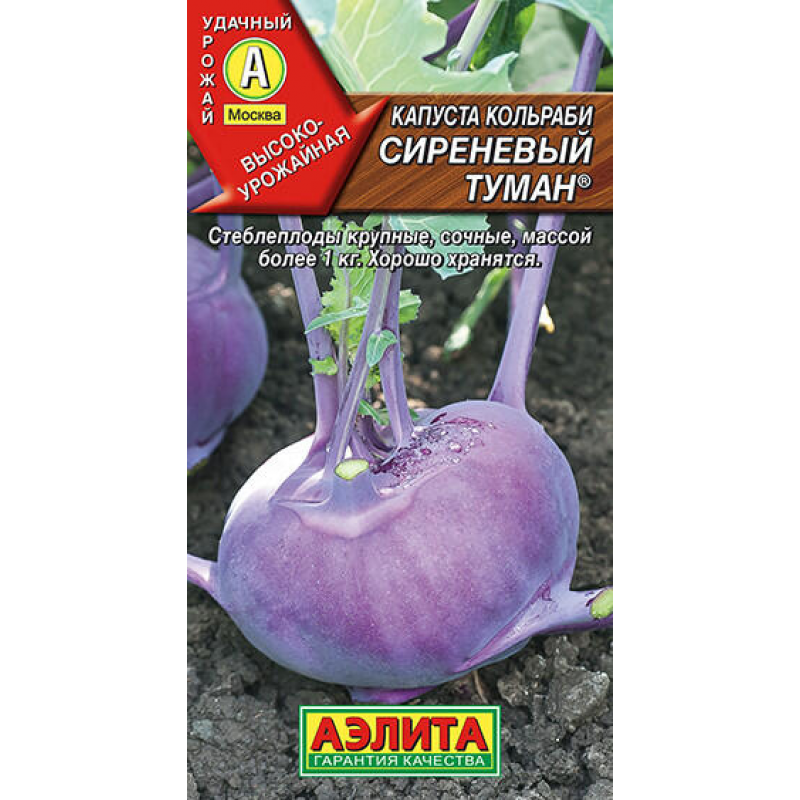 Капуста кольраби Сиреневый туман ® - высокоурожайный среднеранний сорт с периодом от посева до потребительской спелости 100-110 дней. Сорт формирует крупные стеблеплоды массой более 1 кг с белой сочной мякотью и отличным вкусом. Отличается хорошей лежкостью и транспортабельностью, что делает его идеальным для хранения и перевозки. Урожайность составляет 4-4,5 кг/м². Сорт обладает повышенной морозо- и засухоустойчивостью, что обеспечивает стабильный урожай даже в неблагоприятных погодных условиях. Рекомендуется для использования в свежем виде и различных видов переработки. Стеблеплоды сохраняют свои вкусовые качества и сочность при правильном хранении.
