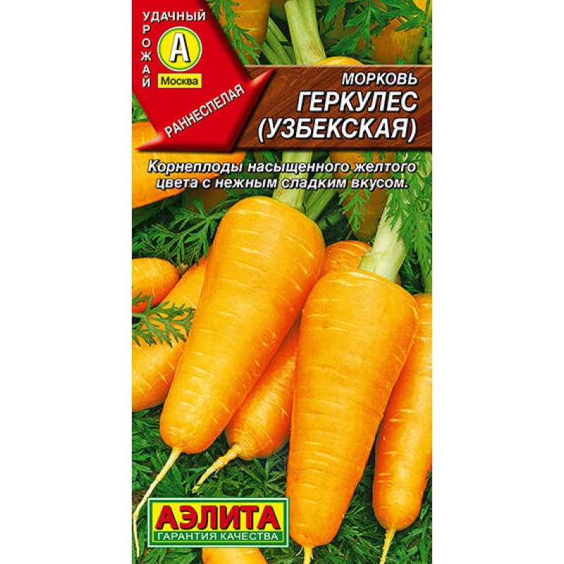 Морковь Геркулес Узбекская - раннеспелый высокопродуктивный сорт, идеально подходящий для получения пучковой продукции. Созревание наступает через 85-90 дней после появления всходов. Корнеплоды отличаются насыщенным желтым цветом, имеют утолщенную тупоконечную форму длиной 11-13 см и массой 90-110 грамм. Мякоть сочная, с нежным сладким вкусом и легким травяным ароматом, что делает этот сорт особенно ценным для кулинарии. Сорт демонстрирует отличную устойчивость к растрескиванию и основным болезням культуры, что обеспечивает стабильный урожай даже при неблагоприятных погодных условиях. Морковь Геркулес прекрасно подходит для выращивания как в открытом грунте, так и в тепличных условиях, обеспечивая ранний урожай качественных корнеплодов.