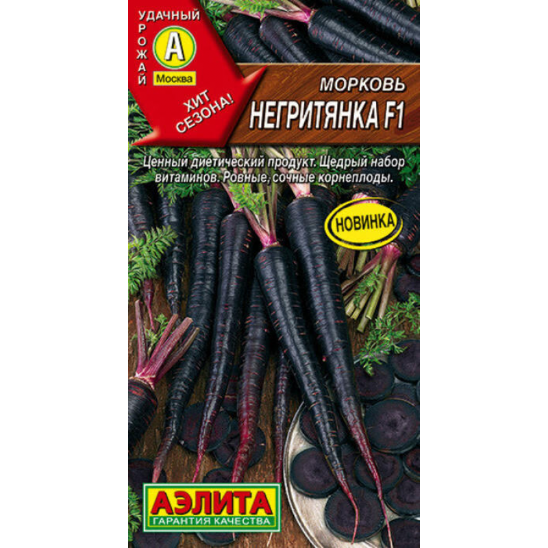 Морковь Негритянка F1 - необыкновенная новинка для самых искушенных покупателей! Этот уникальный гибрид отличается неприхотливостью и пластичностью, что позволяет получать стабильный урожай 5-7 кг/м² даже при неблагоприятных погодных условиях. Корнеплоды массой 70-110 г имеют длинную, ровную и гладкую форму, что облегчает их очистку и переработку. Главная особенность сорта - полностью черная мякоть на срезе без плотной сердцевины. Мякоть нежная, сочная, богата витаминами, минералами и ценным инулином. Период от всходов до массовой уборки составляет 95-110 дней. Эта морковь станет яркой изюминкой традиционных блюд и неповторимой находкой для воплощения новых кулинарных рецептов. Ее сок является знаменитым натуральным красителем, который придает блюдам насыщенный темный цвет без использования искусственных добавок.