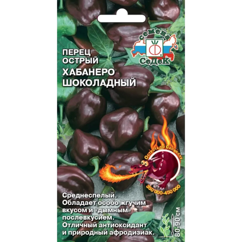 Шоколадный Хабанеро - один из самых жгучих перцев в мире с уникальным шоколадным оттенком и неповторимым вкусом. Этот среднеспелый сорт родом из Мексики созревает за 110-115 дней и идеально подходит для выращивания в теплицах и пленочных укрытиях. Растение прямостоячее, мощное, высотой 80-90 см, с обильным и продолжительным плодоношением. Плоды имеют характерную форму фонарика, длиной 4-5 см, шириной 3 см, массой 30-50 г, с сильно морщинистой поверхностью. В технической спелости они ярко-зеленые, а при полном созревании приобретают насыщенный шоколадный цвет. Острота по шкале Сковилла составляет впечатляющие 350 000-450 000 единиц, что делает этот перец настоящим испытанием для любителей экстремальных вкусов. Помимо невероятной жгучести, Хабанеро Шоколадный обладает выраженным перечным ароматом и специфическим послевкусием «с дымком», что придает блюдам особую пикантность. Сорт отличается неприхотливостью в выращивании и высокой урожайностью, что делает его отличным выбором как для опытных огородников, так и для начинающих любителей острых перцев.