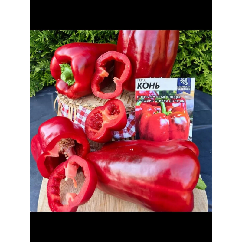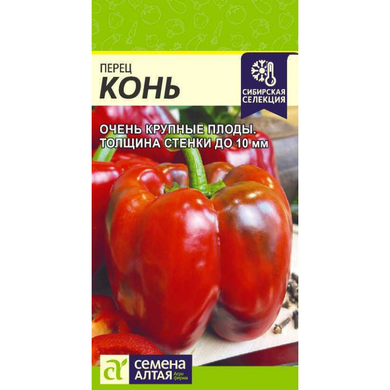 Семена перца Конь от производителя Семена Алтая - среднеспелый высокопродуктивный сорт для открытого грунта и теплиц. Период от всходов до созревания составляет 105-115 дней. Растение компактное, полураскидистое, высотой 50-70 см, не требует формирования, что упрощает уход. Плоды кубовидной формы, очень крупные, массой 250-350 г, с толщиной стенки до 7-10 мм. В биологической спелости приобретают насыщенный тёмно-красный цвет, иногда с оранжево-коричневым оттенком. Идеально подходит для потребления в свежем виде, приготовления салатов, зимних заготовок, фарширования и заморозки. Сорт предпочитает солнечные участки с легкими плодородными нейтральными почвами. Рекомендуется выращивать после моркови, капусты, свеклы, бобовых и тыквенных культур. В упаковке 10 качественных семян. Произведено в России.