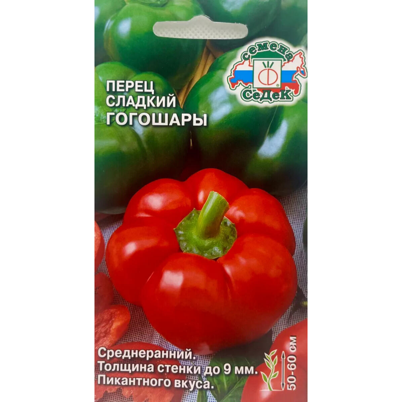 Семена перца сладкого Гогошары от компании СеДек - среднеранний сорт с периодом созревания 110-115 дней, идеально подходящий для выращивания в открытом грунте и пленочных теплицах. Растение полураскидистое, штамбовое, высотой 50-60 см, что делает его удобным для ухода и сбора урожая. Плоды отличаются крупными размерами, округло-плоской (томатовидной) формой с выраженной ребристостью. В технической спелости перцы имеют темно-зеленый цвет, а при полном созревании приобретают насыщенный красный оттенок. Средняя масса плодов составляет 90-130 грамм с толщиной стенки 8-9 мм, что обеспечивает мясистость и сочность. Мякоть сладкая и сочная, с характерной острой пикантной перегородкой, придающей особый вкусовой акцент. Урожайность сорта достигает 7-10 кг с квадратного метра, что делает его экономически выгодным для выращивания. Сорт ценится за интенсивное плодоношение, хорошую транспортабельность и оригинальный вкус плодов. Семена произведены в России, упакованы в защищенный пакет весом 0,1 грамма, что обеспечивает оптимальное количество для посадки.