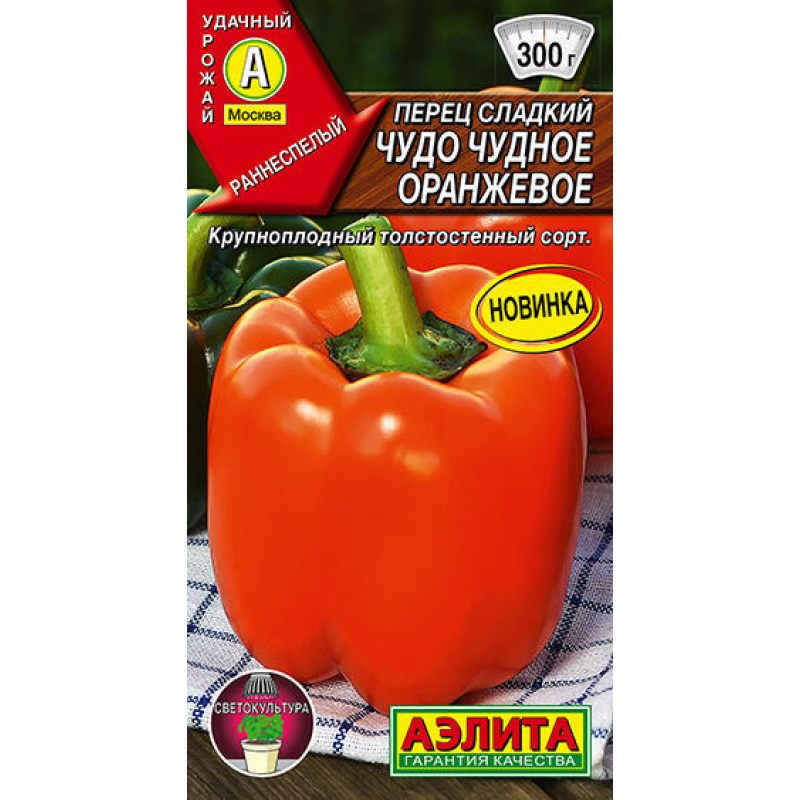 Компактные растения с необычайно крупными и яркими оранжевыми плодами. Сорт ранний, техническая спелость наступает на 115-120 день после всходов. Рекомендуется для защищенного грунта в средней полосе, в южных регионах – для открытого. Растения в теплицах вырастают до 50-60 см, а перцы достигают массы 250-300 г. Стенки плодов мясистые и сочные, толщиной 8-9 мм. Перцы великолепны в свежем виде, отлично подходят для приготовления на гриле и консервирования. Урожайность в теплице 7-8 кг/м 2.