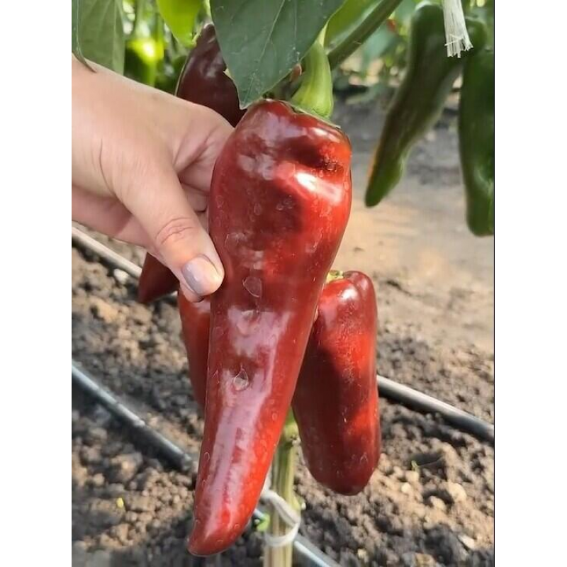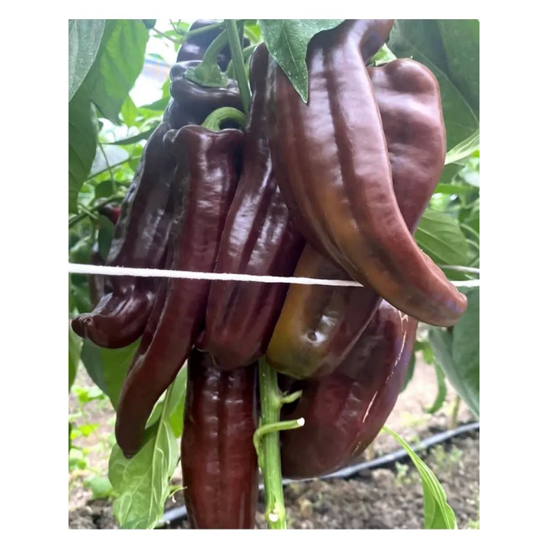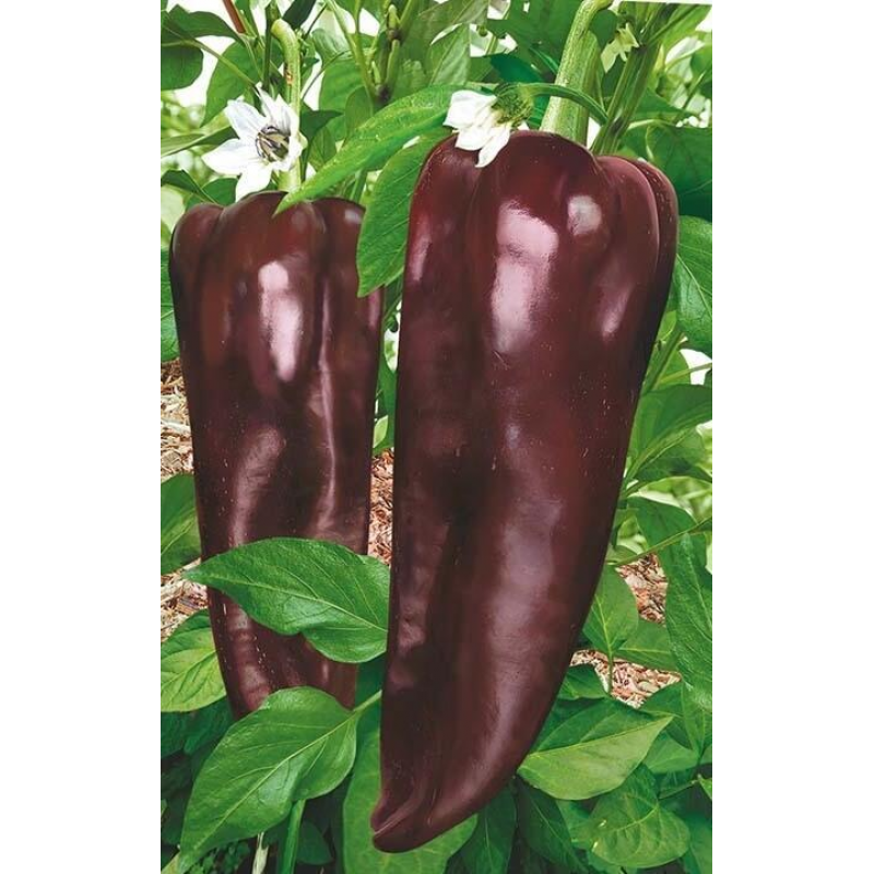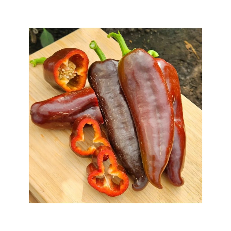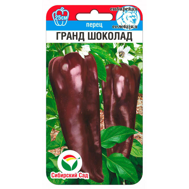 Растение крепкое, высотой 0,7-1м, с подвязкой хорошо выдерживает большую нагрузку плодов. Плоды темно-коричневые, конусовидные с закручивающимся носиком, диной до 25см, массой до 250г, с малым количеством семян. Мякоть сочная бордовая, на вкус сладкая как шоколад. Крупные вкусные плоды добавляют в гарниры и ассорти, в свежие салаты, запекании, жарке, в маринованном и консервированном виде. Урожайность высокая 3,5-4кг с куста.