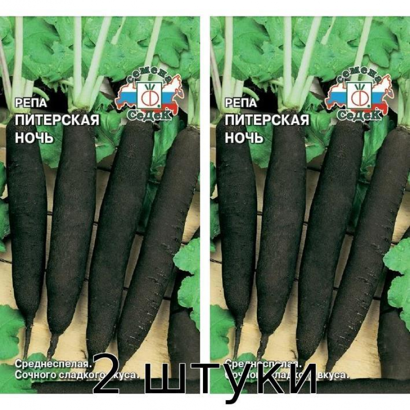 Среднеспелый сорт репы Питерская ночь с периодом созревания 70-80 дней отличается уникальным внешним видом, напоминающим редьку. Растение формирует полупрямостоячую, сильнорослую розетку листьев. Корнеплоды удлиненно-цилиндрической формы, черного цвета, массой 200-250 грамм каждый. Мякоть белая, сочная, нежная, с приятным сладким вкусом. Сорт демонстрирует высокую урожайность - 2,5-3,5 кг с квадратного метра. Особую ценность представляют устойчивость к преждевременному стеблеванию и стрессоустойчивость растения. Репа Питерская ночь содержит богатый комплекс витаминов и микроэлементов, при этом полностью лишена крахмала, что делает ее идеальным продуктом для диетического питания. Отлично подходит для выращивания на приусадебных участках и в фермерских хозяйствах.
