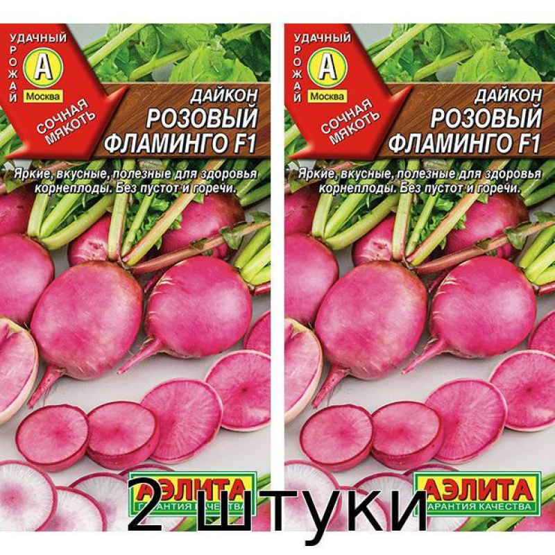 Дайкон Розовый фламинго F1 - среднеспелый гибрид с насыщенным цветом и отличным вкусом, который созревает через 70 дней после посева. Продуктивный сорт формирует гладкие, ровные корнеплоды среднего размера массой до 150 грамм. Мякоть сочная, без волокон и пустот, обладает приятным вкусом. Особенность гибрида - интенсивность окраски сердцевины корнеплодов усиливается по мере созревания, что делает его не только вкусным, но и декоративным. Растение отличается устойчивостью к комплексу заболеваний культуры, что обеспечивает стабильный урожай даже при неблагоприятных условиях. Идеально подходит для летнего, осеннего и зимнего потребления в свежем виде, для салатов и различных кулинарных блюд. Гибрид хорошо хранится при правильных условиях, сохраняя свои вкусовые качества и полезные свойства.