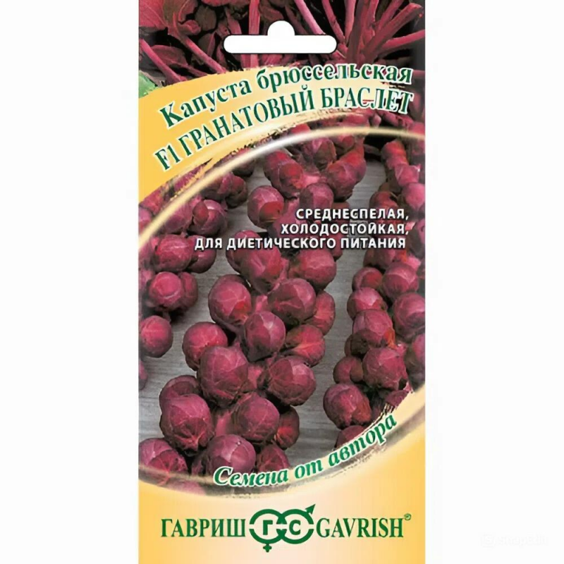 Среднеспелый гибрид брюссельской капусты Гранатовый браслет F1 с периодом созревания 120 дней от высадки рассады до технической спелости. Растение высотой 60-70 см формирует в пазухах листьев 30-40 мелких кочанчиков общей массой 400-500 г. Кочанчики округлой формы, среднего размера, отличаются насыщенной пурпурно-красной окраской, которая становится более интенсивной при понижении температур. Гибрид обладает высокой холодостойкостью и выдерживает заморозки до -7°С, что делает его идеальным для выращивания в регионах с прохладным климатом. Урожайность составляет 1,5-2,0 кг/м². Кочанчики обладают ценными диетическими качествами и нежным вкусом после кулинарной обработки. Рекомендуется для выращивания через рассаду с посевом в марте-апреле и высадкой в грунт в мае по схеме 50×60 см.