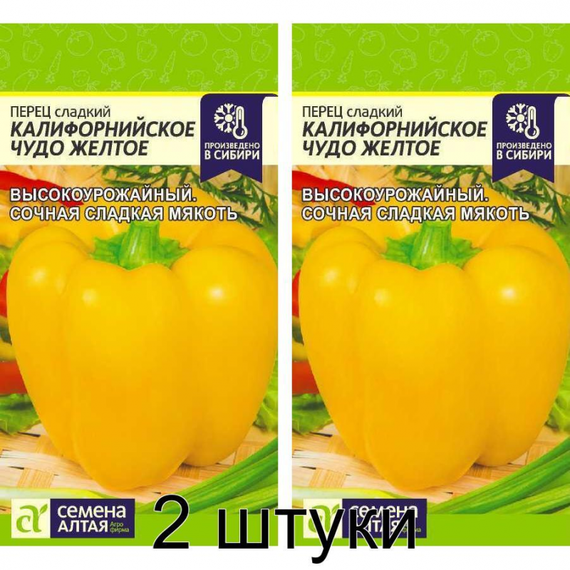 Семена перца сладкого Калифорнийское чудо жёлтое от производителя "Семена Алтая" - среднеспелый высокоурожайный сорт для открытого и защищенного грунта. Растения кустового типа достигают высоты 60-75 см, формируют красивые кубовидные плоды насыщенного желтого цвета. Плоды крупные, массой 150-160 г, длиной 10-11 см, с толстыми стенками 5-6 мм. Мякоть сочная, мясистая, сладкая и очень вкусная. Сорт отличается стабильной урожайностью и отличными товарными качествами. Подходит для домашней кулинарии, свежего потребления, приготовления салатов и консервирования. Выращивается рассадным способом, хорошо адаптирован к различным условиям выращивания. Упаковка содержит 0,2 г качественных семян российского производства, что обеспечивает надежную всхожесть и здоровое развитие растений.