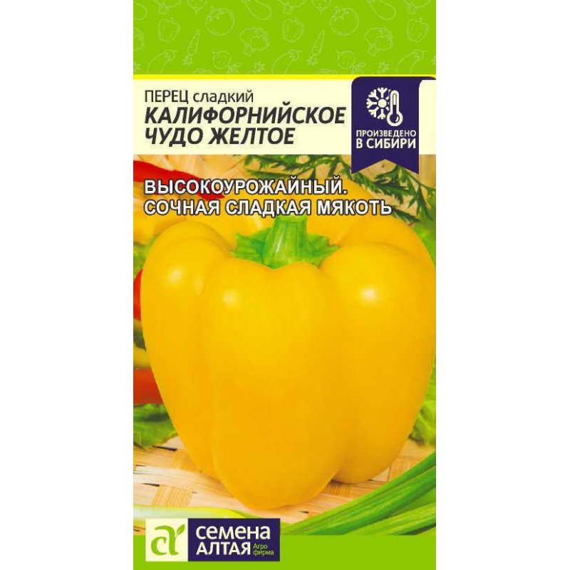 Семена перца сладкого Калифорнийское чудо жёлтое от производителя "Семена Алтая" - среднеспелый высокоурожайный сорт для открытого и защищенного грунта. Растения кустового типа достигают высоты 60-75 см, формируют красивые кубовидные плоды насыщенного желтого цвета. Плоды крупные, массой 150-160 г, длиной 10-11 см, с толстыми стенками 5-6 мм. Мякоть сочная, мясистая, сладкая и очень вкусная. Сорт отличается стабильной урожайностью и отличными товарными качествами. Подходит для домашней кулинарии, свежего потребления, приготовления салатов и консервирования. Выращивается рассадным способом, хорошо адаптирован к различным условиям выращивания. Упаковка содержит 0,2 г качественных семян российского производства, что обеспечивает надежную всхожесть и здоровое развитие растений.