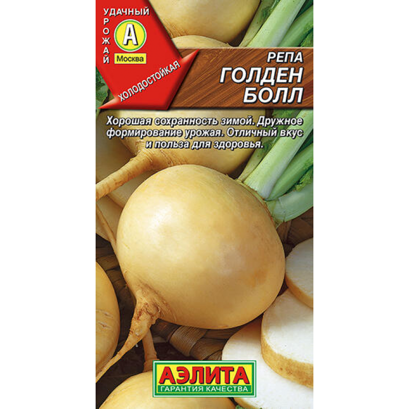 Репа Голден болл - продуктивный холодостойкий сорт с периодом созревания 60-70 дней от всходов до потребительской спелости. Формирует мощную полупрямостоячую розетку листьев высотой 30-40 см. Корнеплоды округлой формы с тонкой гладкой желтой кожицей и сочной нежной желтой мякотью. Средняя масса корнеплодов составляет 100-150 грамм. Сорт отличается дружным формированием урожая и отличной лежкостью в зимний период. Вкусовые качества репы Голден болл оцениваются как великолепные - мякоть сладкая, сочная, без горечи. Урожайность достигает 2-3 кг с квадратного метра. Идеально подходит для свежего потребления, приготовления салатов, тушения и запекания. Сорт устойчив к неблагоприятным погодным условиям и подходит для выращивания в различных климатических зонах.