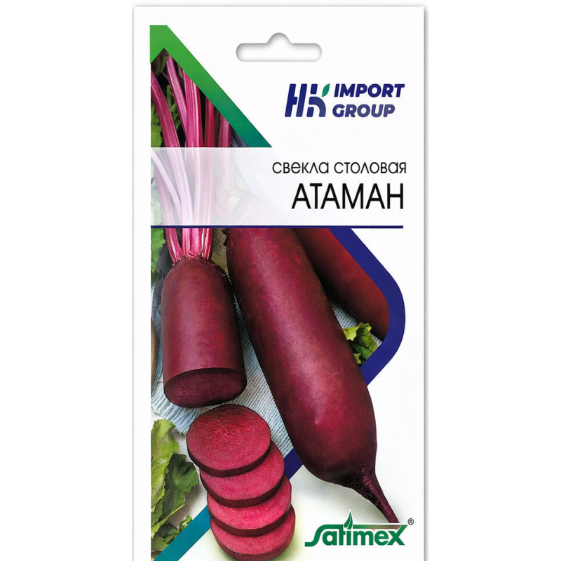 Среднепоздний сорт столовой свеклы Атаман от немецкого производителя Satimex отличается цилиндрической формой корнеплодов, гладкой кожицей и насыщенной равномерной окраской. Корнеплоды вырастают выровненными, длиной 10-15 см, с массой 230-300 г. Мякоть тёмно-красная, сочная и нежная, без выраженных концентрических колец, обладает приятным сладким вкусом. Сорт демонстрирует неприхотливость в выращивании, устойчивость к цветушности и высокую урожайность - при правильной агротехнике можно получить до 11 кг с квадратного метра. Свекла Атаман формирует стоячую розетку зелёных листьев с красноватым оттенком и красными прожилками. Сорт идеально подходит для свежего употребления, переработки и длительного хранения, сохраняя отличные товарные качества на протяжении всего периода хранения. Срок созревания составляет 115-125 дней, рекомендуемая схема посадки - 5×10 см.