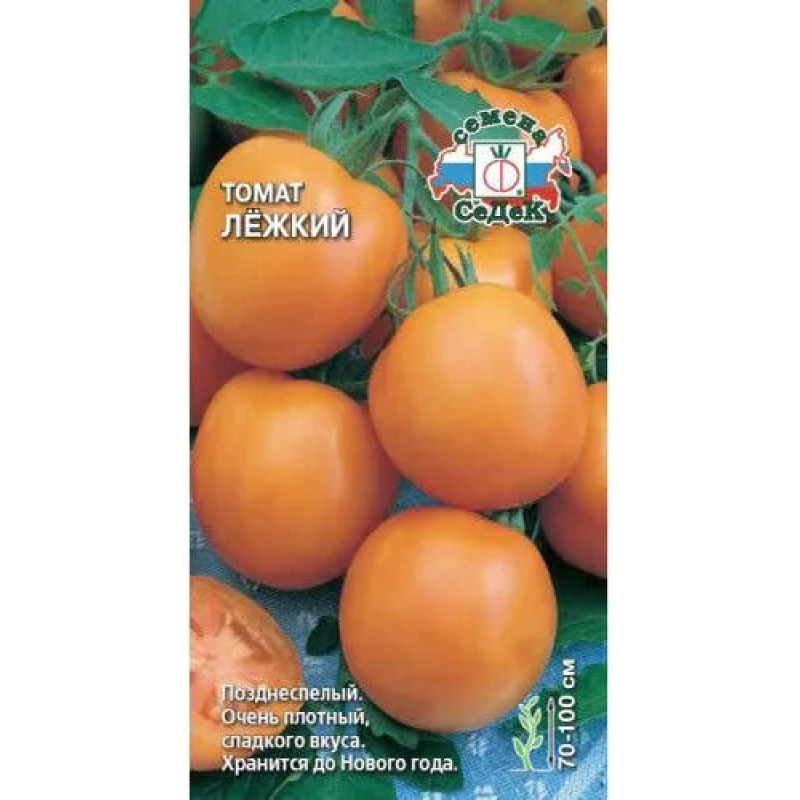 Томат Лежкий F1 - позднеспелый гибридный сорт от компании Седек, идеально подходящий для длительного хранения. Период от всходов до созревания составляет 115-120 дней. Растение кустистое, высотой 0,7-1 метр, требует умеренного пасынкования и подвязки. В каждой кисти формируется 5-6 красивых плоскоокруглых плодов ярко-красно-оранжевого цвета массой 100-120 грамм. Плоды отличаются исключительной плотностью и не растрескиваются даже при длительном хранении. Этот сорт обладает устойчивостью к комплексу болезней и высоким содержанием сухих веществ в плодах. Главная особенность - выдающаяся лежкость: томаты, собранные зелеными, могут храниться до Нового года, что делает их отличным выбором для зимнего потребления. Подходит для выращивания в открытом грунте и под пленочными укрытиями.