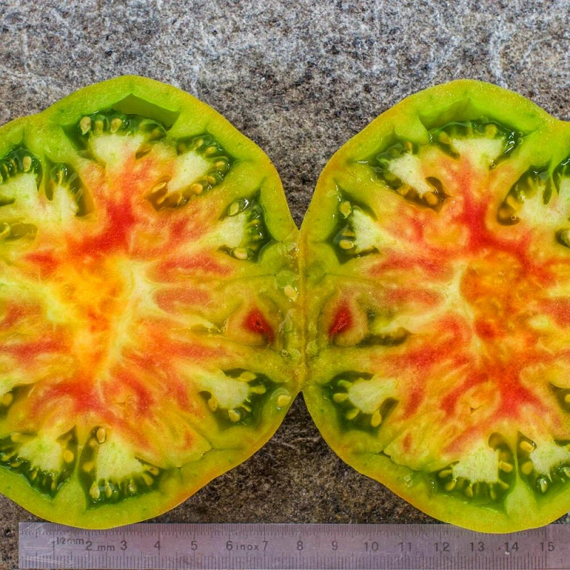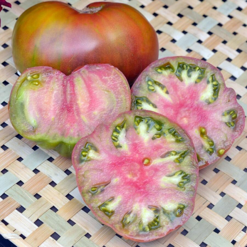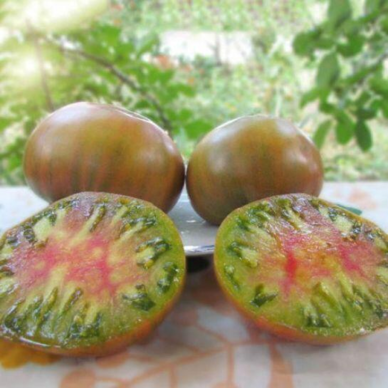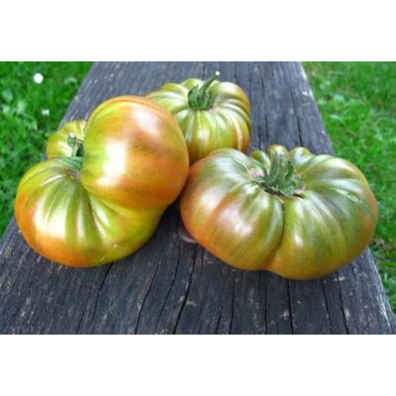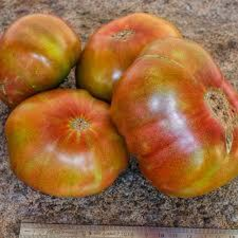 Редкий необыкновенно вкусный биф-томат родом из США! Для защищенного грунта. Среднеспелый – от всходов до сбора первых плодов 110- 115 дней. Растение индетерминантное, высотой в теплице 2,0 м и более. Плоды крупные, массой 200-400 г. При созревании на разных плодах проявляются самые различные оттенки: бронзовый, салатовый, охристый, желтоватые и розовые размывы. В стадии биологической спелости становятся благородного медного цвета с бордово-зелеными плечиками. Мякоть в разрезе невероятно красивая. Томаты великолепны в свежем виде и салатах. Урожайность в теплице до 10 кг/м2.
