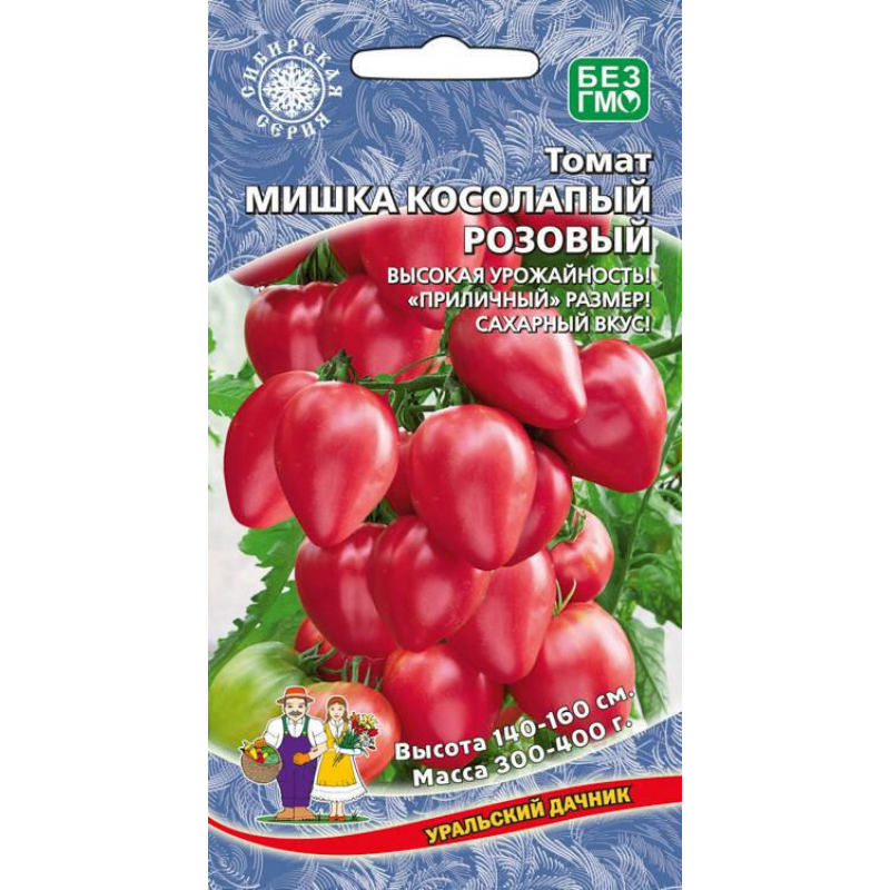 Томат МИШКА КОСОЛАПЫЙ РОЗОВЫЙ - популярный высокоурожайный сорт сибирской селекции, специально созданный для выращивания в закрытом грунте. Плоды отличаются необычной жемчужно-розовой окраской и красивой сердцевидной формой. Томаты крупные, массой 300-400 граммов, а первые плоды могут достигать впечатляющих 600 граммов. Мякоть мясистая, сахаристая на изломе, очень сочная и ароматная. Этот сорт считается одним из самых вкусных для употребления в свежем виде - идеально подходит для летних салатов, приготовления свежевыжатых соков и домашней томатной пасты. Растения формируют в два стебля для максимальной урожайности. Сорт устойчив к неблагоприятным условиям и показывает отличные результаты в тепличном выращивании.
