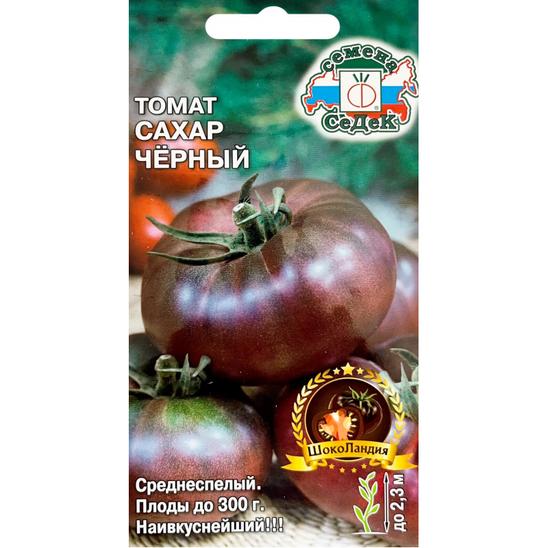 Среднеспелый сорт томата Сахар Черный от ШокоЛандия - это уникальный крупноплодный сорт салатного назначения для выращивания в парниках и теплицах. Растение индетерминантное, среднеоблиственное, достигает высоты до 2,3 метров. Период созревания составляет 110-115 дней. В каждой кисти формируется 4-5 плодов плоскоокруглой ребристой формы массой 250-300 грамм каждый. Незрелые плоды имеют зеленый цвет с темно-зеленым пятном, а при полном созревании приобретают насыщенный темно-коричневый (шоколадный) оттенок. Плоды отличаются тонкой кожурой, мясистой и сочной мякотью с выраженным ароматом. Вкусовая особенность - повышенное содержание сахаров с едва заметной кислинкой, что делает эти томаты особенно сладкими и ароматными. Урожайность сорта составляет 8-9 кг с квадратного метра. Плоды обладают высокой декоративностью благодаря своему необычному шоколадному цвету.