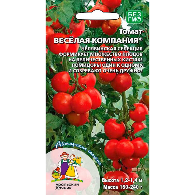 Томат Весёлая компания - авторский сорт с уникальными характеристиками, который станет настоящим украшением вашего огорода. Это детерминантное растение формирует величественные кисти, сплошь увешанные плодами глубокого алого цвета массой 150-240 грамм. Все плоды созревают очень дружно, один к одному, создавая впечатление настоящей весёлой компании на грядке. Мясистые, сладкие томаты с очень тонкой кожей и малым количеством семян отличаются превосходным вкусом. Сорт демонстрирует высокую устойчивость к фузариозу и гнили даже в сырую погоду, что делает его надежным выбором для различных климатических условий. Урожайность может достигать более 20 кг с квадратного метра, обеспечивая обильный сбор вкусных и качественных плодов. Идеально подходит как для свежего потребления, так и для консервирования.