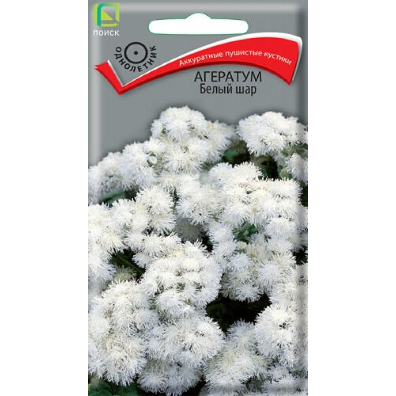 Агератум Белый шар - изящный однолетник с аккуратными пушистыми соцветиями белоснежного цвета. Компактный кустик высотой до 30 см с крупными опушенными листьями образует плотные куртины. Соцветия среднеплотные, крупные 1,5-2,0 см в диаметре, с длинными рыльцами, создающими эффект воздушных белых шариков. Сорт отличается обильным и продолжительным цветением с середины июня до октября. Растение хорошо переносит стрижку, что позволяет формировать аккуратные бордюры и поддерживать декоративный вид в течение всего сезона. Агератум теплолюбив и засухоустойчив, быстро растет на легких питательных почвах, предпочитает солнечные места. Идеально подходит для оформления цветников, бордюров, рабаток и контейнерных композиций.
