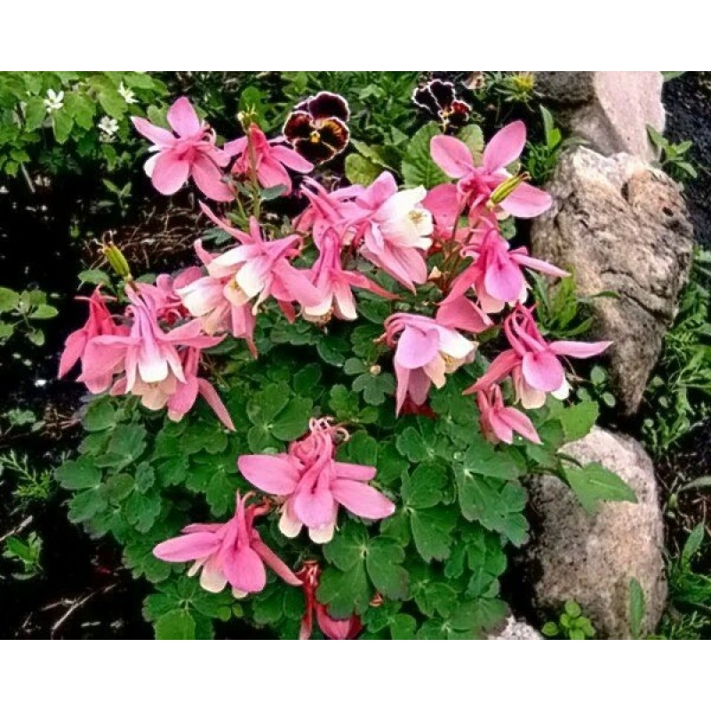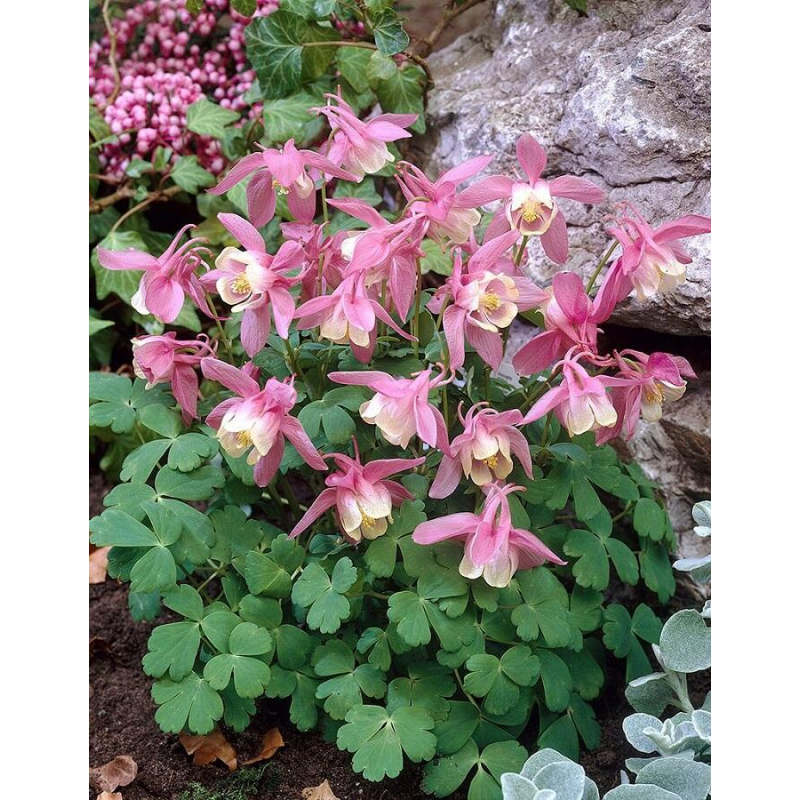 Яркий миниатюрный многолетник с крупными цветами. Компактный, хорошо ветвящийся кустик высотой 15 см с тройчатыми сизо-зелёными листьями. Цветки розово-белые колокольчатой формы со шпорцами, вниз смотрящие, крупные до 5 см в диаметре. Используют для обрамления клумб, бордюров, в альпинариях, рокариях, а также для выращивания в горшках и контейнерах.