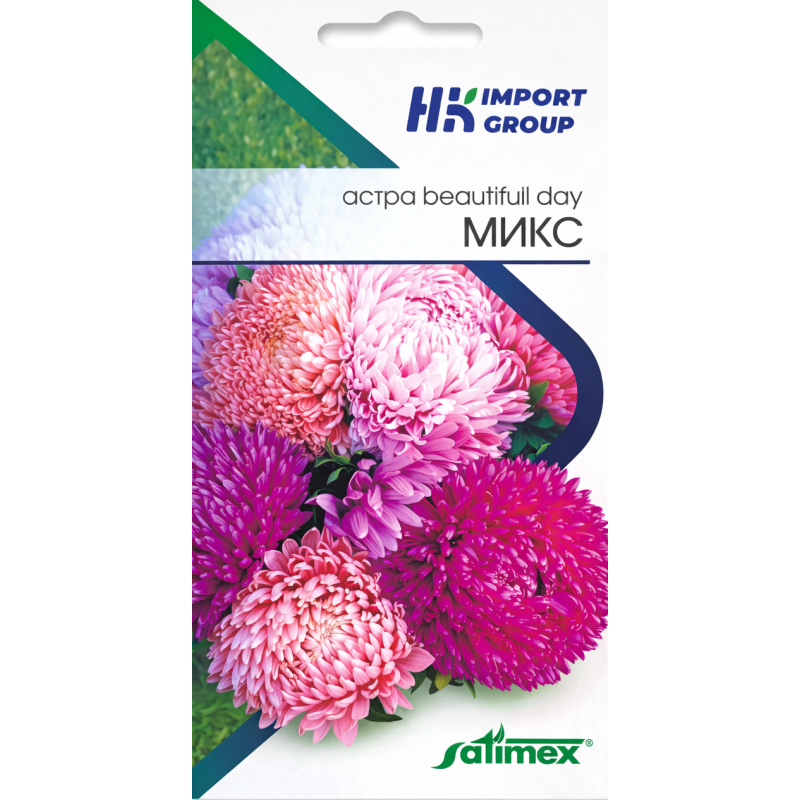 Астра Beautiful Day Микс — эффектная смесь ярких крупноцветковых астр с густомахровыми шаровидными соцветиями. В упаковке представлены оттенки розового, малинового, сиреневого и нежно-розового цветов, что позволяет создать насыщенную и декоративную клумбу без дополнительного подбора сортов.