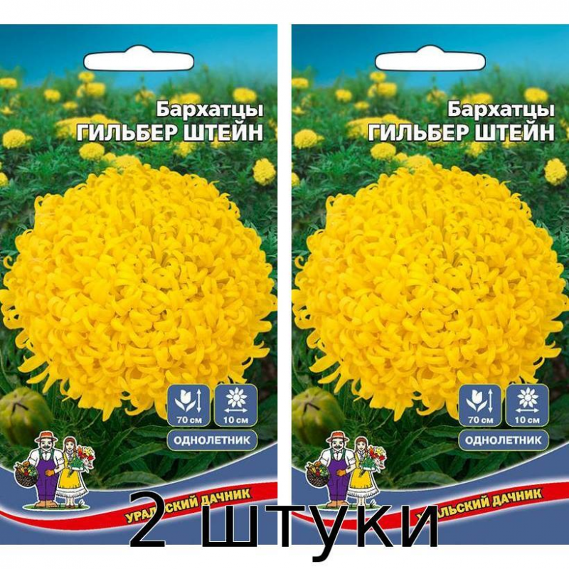 Роскошные бархатцы ГИЛЬБЕР ШТЕЙН - это мощные кусты с многочисленными густомахровыми соцветиями нежного золотисто-желтого цвета хризантемовидной формы. Эти бархатцы отличаются исключительной декоративностью и устойчивостью к неблагоприятным погодным условиям. Они прекрасно держат форму, не разваливаются от дождя и ветра, а также переносят понижение температуры без ущерба для красоты своих соцветий. Растения гармонично выглядят в любых цветниках, клумбах и рабатках, создавая яркие акценты в садовом дизайне. Кроме эстетической ценности, бархатцы оказывают санитарное воздействие на почву, улучшая ее качество, а также отлично стоят в срезке, сохраняя свежесть и привлекательность в букетах длительное время. Это идеальный выбор для садоводов, ценящих неприхотливость и продолжительное обильное цветение.