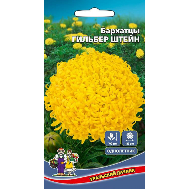 Роскошные бархатцы ГИЛЬБЕР ШТЕЙН - это мощные кусты с многочисленными густомахровыми соцветиями нежного золотисто-желтого цвета хризантемовидной формы. Эти бархатцы отличаются исключительной декоративностью и устойчивостью к неблагоприятным погодным условиям. Они прекрасно держат форму, не разваливаются от дождя и ветра, а также переносят понижение температуры без ущерба для красоты своих соцветий. Растения гармонично выглядят в любых цветниках, клумбах и рабатках, создавая яркие акценты в садовом дизайне. Кроме эстетической ценности, бархатцы оказывают санитарное воздействие на почву, улучшая ее качество, а также отлично стоят в срезке, сохраняя свежесть и привлекательность в букетах длительное время. Это идеальный выбор для садоводов, ценящих неприхотливость и продолжительное обильное цветение.