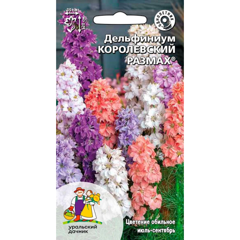 Дельфиниум КОРОЛЕВСКИЙ РАЗМАХ® - однолетнее элегантное декоративное растение, формирующее величественные кусты высотой до 120 см. Этот сорт поражает яркими и разнообразными окрасками, а также продолжительным периодом цветения. Крупные цветки собраны в густые, плотные кистевидные соцветия длиной до 35 см, создавая впечатляющие вертикальные акценты в саду. Цветовая палитра включает множество оттенков красного - от нежно-розового до яркого красного и медно-красного, а также синие тона - от светлого голубого до глубокого чёрно-синего и фиолетового. Растение отличается холодостойкостью и способностью к самовозобновлению через самосев, что делает его прекрасным многолетним украшением сада при минимальном уходе. Дельфиниум идеально подходит для создания живописных композиций, посадки вдоль стен и оград, а также для срезки - соцветия сохраняют свежесть в вазе до 10 дней.