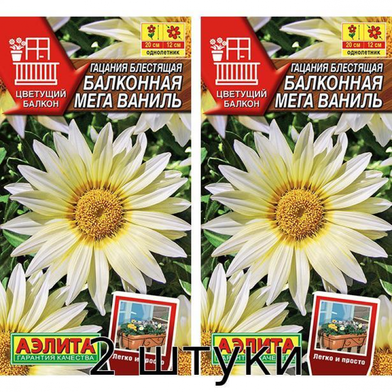 Редкий сорт летника с невероятно крупными цветками ванильного оттенка. Идеально подходит для выращивания в горшках и балконных ящиках на солнечной стороне дома. Компактные крепкие кустики высотой около 20 см украшены множеством роскошных соцветий диаметром 10-12 см, которые непрерывно появляются с июня до первых заморозков. Растения отличаются жизнестойкостью и нетребовательностью в уходе, взрослые экземпляры достаточно засухоустойчивы. Гацания сохраняет декоративность на протяжении всего сезона, радуя обильным цветением. Прекрасно подходит для оформления рабаток, бордюров, клумб и каменистых горок. Для продления цветения осенью растения можно занести в дом, а для сохранения сорта до следующего сезона обеспечить зимовку в светлом прохладном помещении при температуре +8...+10°С.