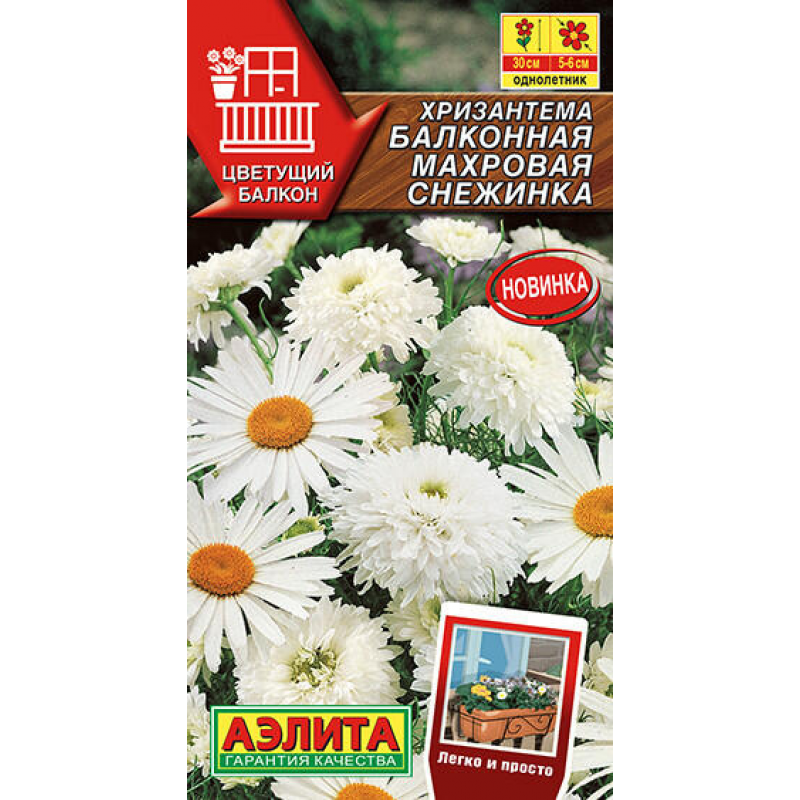 Хризантема балконная Махровая снежинка - очаровательный однолетник, идеально подходящий для выращивания в балконных ящиках и горшечной культуре. Это неприхотливое, холодостойкое растение отличается быстрым ростом и обильным цветением. На фоне изящной перистой листвы, с июля и до осенних заморозков, распускаются махровые, полумахровые и простые соцветия диаметром 5-6 см. Кустики сильноветвистые, достигают около 30 см в высоту и ширину, что делает их идеальными для компактных пространств. Сорт может выращиваться как соло, так и в сочетании с другими низкорослыми летниками, создавая красивые композиции. Хризантема Махровая снежинка также подходит для срезки, позволяя украсить интерьер свежими цветами. Растение предпочитает солнечное местоположение и умеренно плодородную, дренированную, некислую почву. Для стимуляции ветвления молодые кустики рекомендуется прищипывать, а удаление старых соцветий способствует более пышному и продолжительному цветению.