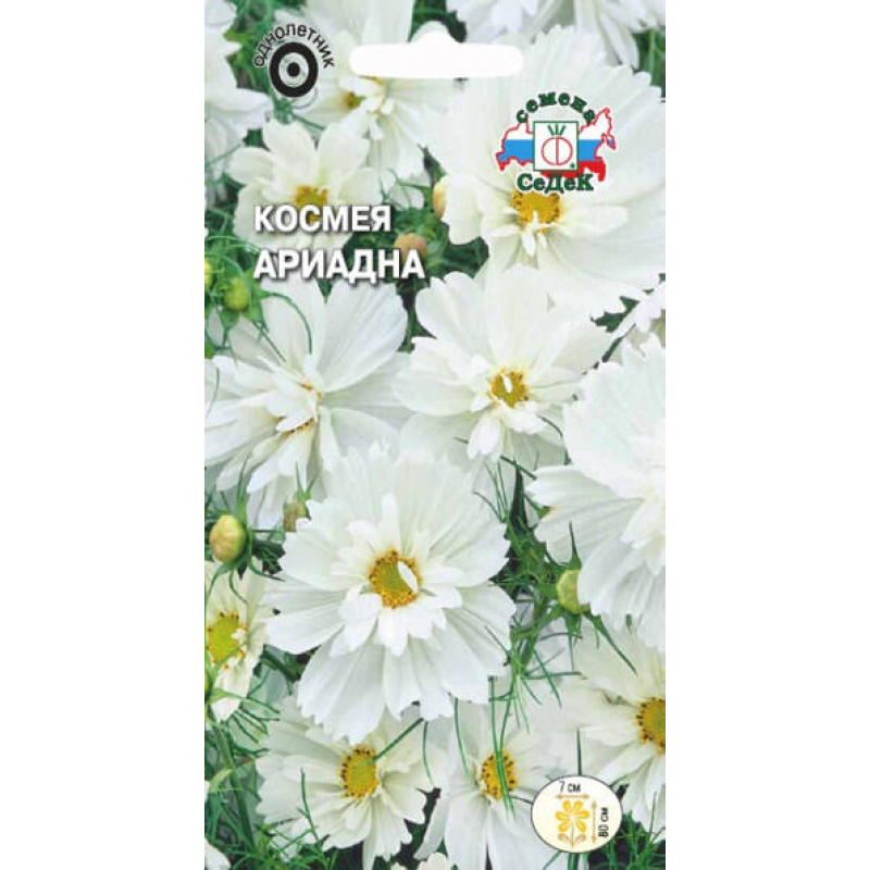Космея Ариадна - изысканный однолетник с белыми махровыми соцветиями, которые станут украшением любого сада. Это травянистое растение высотой до 80 см с густоветвистыми прямостоячими стеблями и ажурными листьями, рассеченными на нитевидные доли. Крупные цветки диаметром 7 см отличаются изящной формой и нежной белоснежной окраской. Космея Ариадна отличается продолжительным цветением, которое длится до первых заморозков, обеспечивая ваш сад красотой на протяжении всего сезона. Растение светолюбивое, холодостойкое и нетребовательное к почвенным условиям, что делает его идеальным выбором для начинающих садоводов. Регулярное удаление отцветших соцветий стимулирует образование новых бутонов, поддерживая декоративность растения. Космея прекрасно подходит для срезки и может стоять в вазе 3-5 дней, если срезать цветы в стадии полуроспуска.