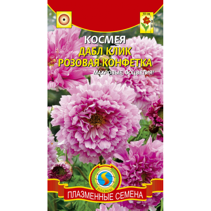 Космея ДАБЛ КЛИК РОЗОВАЯ КОНФЕТКА - великолепный однолетний сорт с махровыми соцветиями нежно-розового цвета с желтой сердцевиной. Растение формирует ветвящийся куст высотой до 100 см и диаметром около 50 см, покрытый ажурной листвой. Крупные махровые корзинки-соцветия достигают 10 см в диаметре и парят над зеленью, создавая эффект воздушности. Космея отличается продолжительным цветением с июля до первых заморозков, холодостойкостью и неприхотливостью в выращивании. Идеально подходит для декорирования заднего плана цветников, создания сборных композиций, обрамления зон отдыха. Срезанные цветы долго сохраняют свежесть в вазах, что делает их прекрасным выбором для букетов. Растение предпочитает солнечные, защищенные от ветра места с легкой, хорошо дренированной почвой.