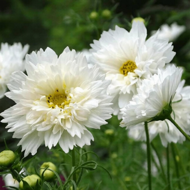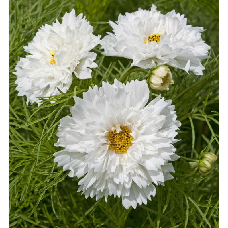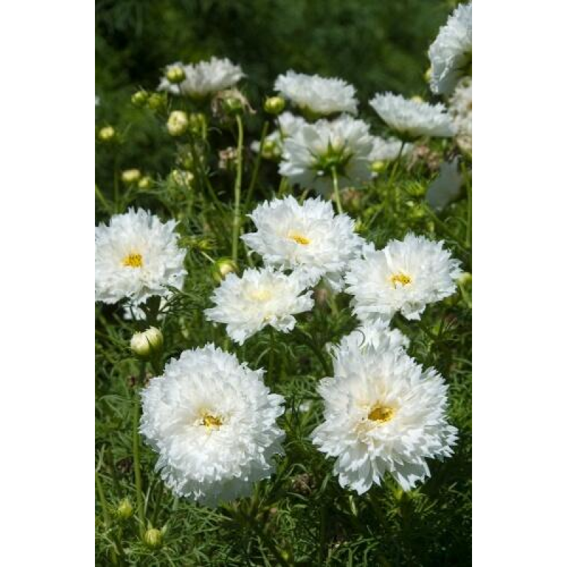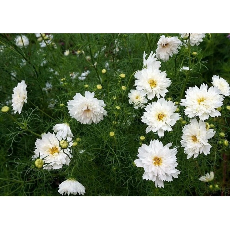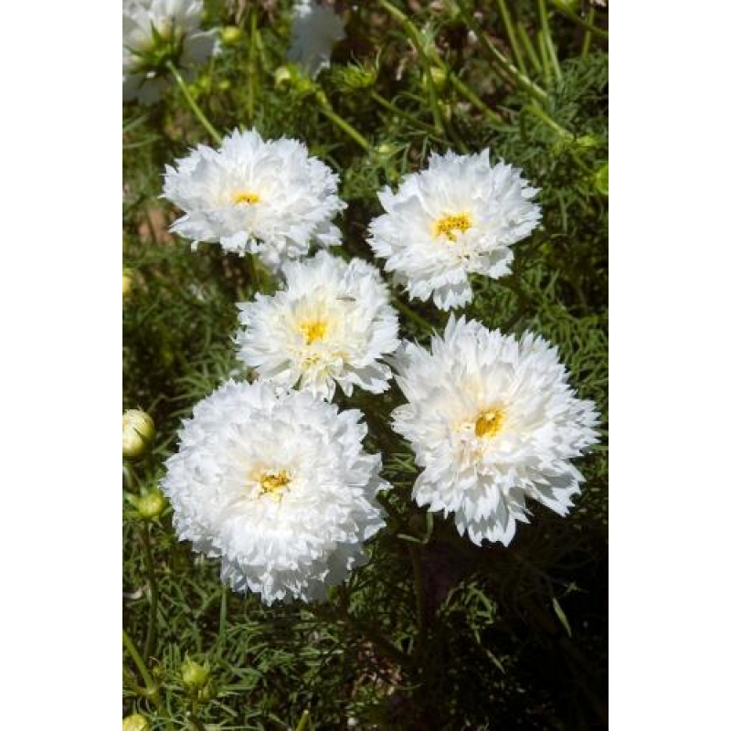 Изобилие белоснежных махровых цветков! Декоративное растение с ажурными сильнорассеченными листьями, высотой около 80 см. Соцветия – махровые корзинки диаметром 7-10 см на крепких стеблях. Великолепно выглядят на клумбах и в бордюрах, особенно большими массивами. Прекрасный материал для срезки.