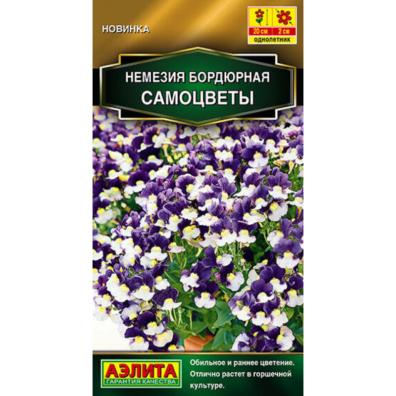 Немезия бордюрная Самоцветы - однолетняя декоративная культура с сильноветвистым стеблем и обилием нежных контрастных цветков. Растения формируют приземистые кустики высотой около 20 см, идеально подходящие для бордюров, цветников и контейнерного озеленения. Цветки окраски «биколор» достигают диаметра 2 см и украшают побеги до сентября. Немезия светолюбива, холодостойка, нуждается в регулярных поливах и подкормках. Для продления периода цветения рекомендуется обрезка старых цветоносов к концу июля. Культура идеально подходит для прямого посева семян в вазоны и контейнеры, где пышные кустики быстро разрастаются и рано зацветают. Высота растений может варьироваться в зависимости от условий выращивания.