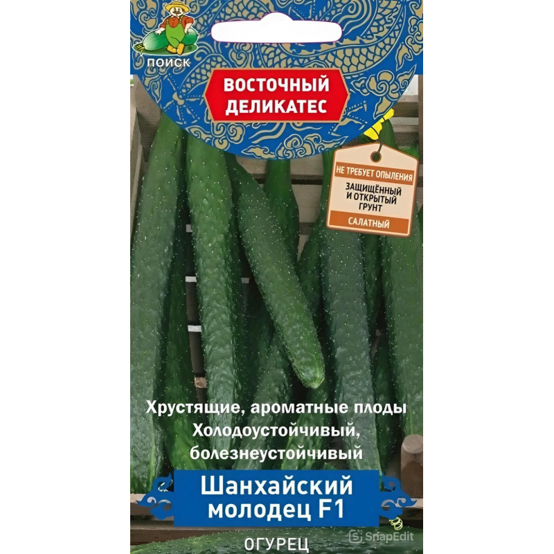 Огурец Шанхайский молодец F1 - партенокарпический раннеспелый гибрид, созданный для получения обильного урожая хрустящих и ароматных плодов. Этот восточный деликатес отличается быстрым созреванием: от всходов до начала плодоношения проходит всего 44-46 дней. Гибрид женского типа цветения формирует длинные плоды 37-40 см с крупными бугорками и небольшой семенной камерой, что обеспечивает отличные вкусовые качества. Плоды обладают высокой плотностью и после сбора долго сохраняют свежесть, не вянут. Растение демонстрирует отличное плодоношение на боковых побегах, что увеличивает общую урожайность. Гибрид обладает комплексной устойчивостью к основным заболеваниям: мучнистой росе, пероноспорозу и фузариозному увяданию. Подходит для выращивания в весенних теплицах, под пленочными укрытиями и в открытом грунте. Универсальное применение плодов позволяет использовать их как для свежего потребления, так и для консервирования и маринования.