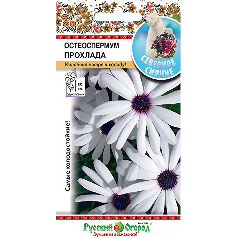 Остеоспермум Прохлада от производителя Русский огород - холодостойкое однолетнее растение, которое станет украшением вашего сада с июня по октябрь. Вырастает до 90 см в высоту, образуя пышные кусты с эффектными ромашковидными цветами. Лепестки белоснежного цвета гармонично сочетаются с контрастной сине-фиолетовой сердцевиной, создавая элегантный и свежий вид. Это растение идеально подходит для создания ярких цветочных композиций, бордюров, миксбордеров и контейнерного озеленения. Остеоспермум Прохлада отличается продолжительным цветением и устойчивостью к прохладной погоде, что делает его отличным выбором для регионов с переменчивым климатом. В упаковке 15 качественных семян, готовых к посеву. Растение предпочитает солнечные участки с плодородной, хорошо дренированной почвой и умеренным поливом. Выращивается через рассаду для получения раннего и обильного цветения.
