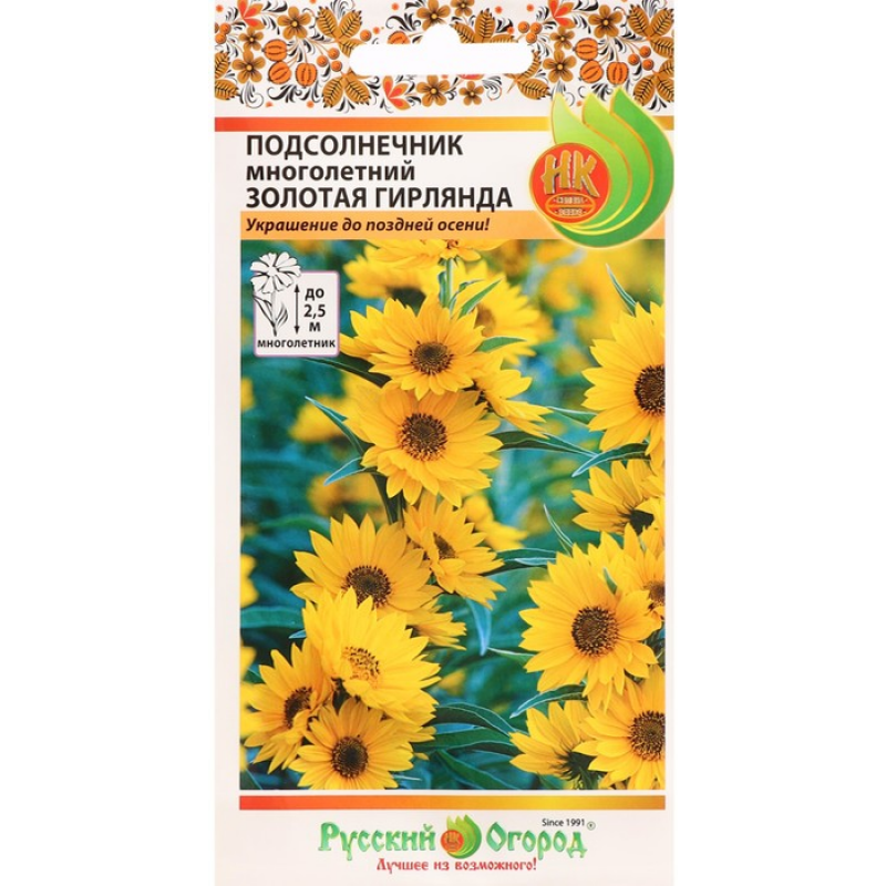Подсолнечник Золотая гирлянда - великолепный многолетний сорт с яркими желтыми цветами, который станет настоящим украшением вашего сада. Это среднеспелое растение достигает впечатляющей высоты до 250 см, создавая эффектные вертикальные акценты в ландшафтном дизайне. Период цветения с августа по октябрь обеспечивает продолжительное наслаждение солнечными красками в осенний период. Идеально подходит для выращивания в открытом грунте на солнечных участках. Крупные желтые соцветия привлекают пчел и бабочек, способствуя опылению других растений в саду. Сорт отличается хорошей устойчивостью и неприхотливостью в уходе. Каждая упаковка содержит 50 качественных семян, что позволяет создать живописную композицию или живую изгородь. Подсолнечник Золотая гирлянда не только декоративен, но и создает особую атмосферу уюта и природной гармонии на вашем участке.