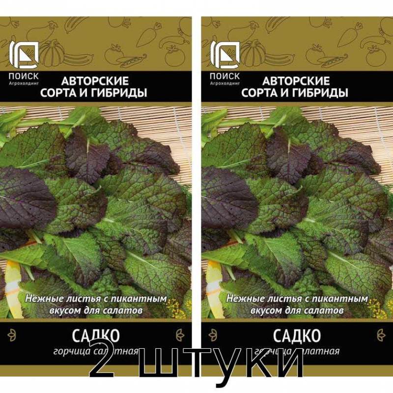 Горчица салатная Садко - среднеспелый сорт с периодом от всходов до сбора урожая всего 22-25 дней. Растение формирует крупные цельные листья насыщенного тёмно-зелёного цвета с интенсивным антоциановым оттенком. Листья обладают слабоострым привкусом, напоминающим столовую горчицу, что придает блюдам пикантную нотку. Масса одного растения достигает 60-70 грамм, что обеспечивает хорошую урожайность. Сорт отличается высокой облиственностью и устойчивостью к стрелкованию, что позволяет получать качественную зелень на протяжении всего сезона. Горчица Садко даёт нежную витаминную продукцию с ранней весны до поздней осени, обеспечивая свежей зеленью в течение всего теплого периода. Идеально подходит для выращивания в открытом грунте и теплицах. Семена фасуются по 1 грамму, что оптимально для домашнего огородничества. Сорт проверен временем и пользуется популярностью у садоводов благодаря своей неприхотливости и стабильной урожайности.