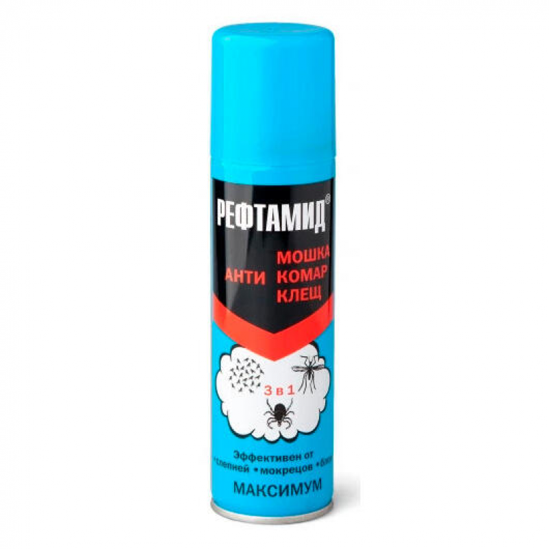 Рефтамид Максимум 3в1 — это эффективный аэрозольный репеллент для комплексной защиты от кровососущих насекомых (комаров, мошек, мокрецов, москитов, слепней, блох) и иксодовых клещей, включая лесных и таёжных. Средство предназначено для нанесения на открытые участки кожи, а также на одежду, занавеси, сетки и другие текстильные изделия. При обработке кожи обеспечивает защиту более 4 часов, а при нанесении на одежду — до 5 суток от клещей и до 30 суток от других насекомых. Для максимального эффекта рекомендуется хранить обработанную одежду в полиэтиленовом пакете. Продукт выпускается в удобной аэрозольной форме объёмом 145 мл, что делает его практичным для использования на природе, даче или в походе. Перед применением упаковку необходимо встряхнуть, а распыление проводить при температуре не ниже +10°C.