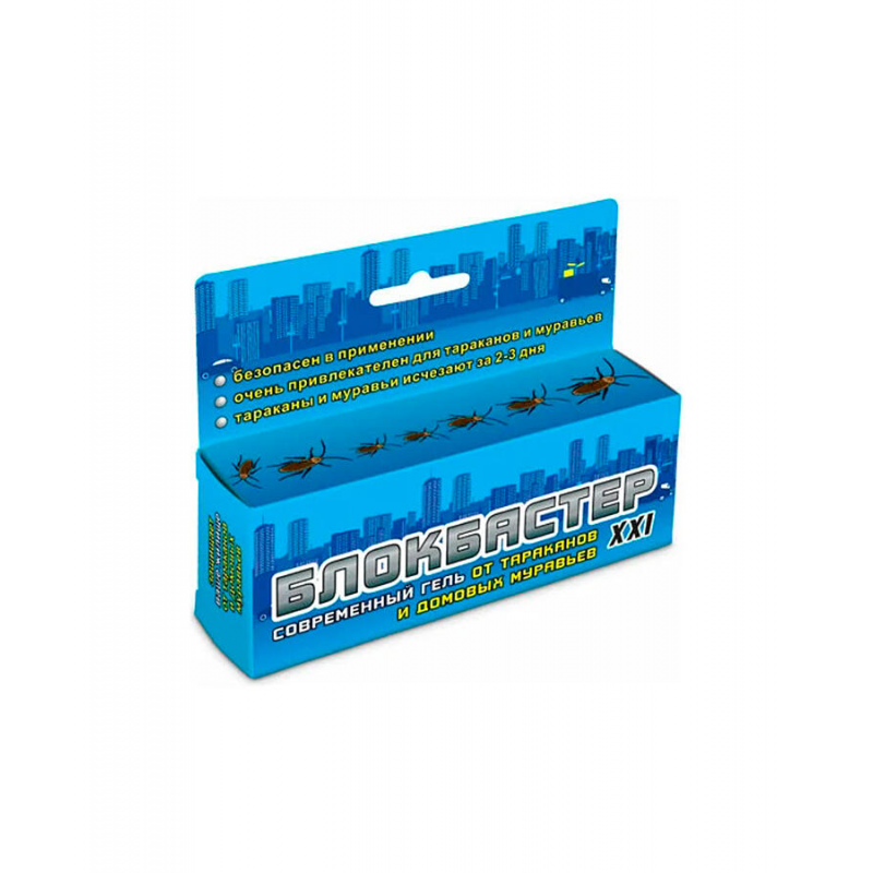Гель БЛОКБАСТЕР от тараканов — это высокоэффективное средство с уникальным 'каскадным' действием. Даже один таракан, съевший приманку, передает смертельную дозу яда до 50 сородичам, обеспечивая массовое уничтожение колонии. В состав входят специальные привлекатели, которые делают гель более желанным для насекомых, чем обычная пища. Средство не высыхает, не портится и сохраняет эффективность длительное время. Оно бесцветно, не имеет запаха, не выделяет вредных веществ и безопасно для аллергиков и астматиков. Добавка 'битрекс' защищает домашних животных от случайного поедания. Один шприц-дозатор (45 г) рассчитан на обработку помещений площадью 70–100 м², гель легко наносится в труднодоступные места.