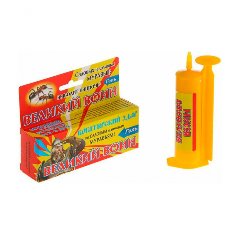 Гель «Великий Воин» — высокоэффективное средство для уничтожения садовых и домашних муравьев, а также тараканов. Он действует как приманка: специальный состав привлекает рабочих муравьев, которые поедают гель сами и доставляют его в колонию, кормя личинок и маток. Это обеспечивает гибель всей колонии, а не отдельных особей. Средство характеризуется длительным кишечным действием — одной обработки хватает на долгий срок. Гель легко наносится благодаря удобному шприцу-дозатору, что позволяет обрабатывать даже труднодоступные места. Подходит для использования на садовых участках (на стволах деревьев, муравьиных тропах) и в помещениях (по периметру). Сохраняет эффективность до 1 месяца на улице и до 2 месяцев внутри. Для достижения наилучшего результата избегайте попадания влаги и пыли на гель.