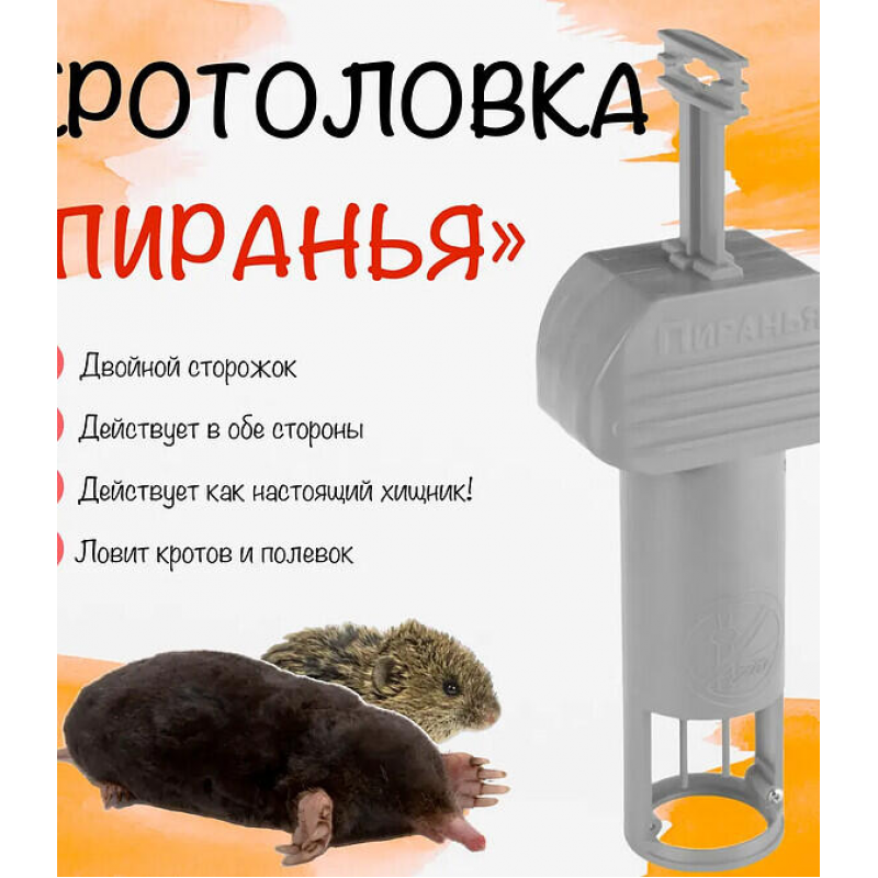 Для использования кротоловки Пиранья определите активные кротовые ходы на участке. Аккуратно вскройте тоннель и установите ловушку в обоих направлениях, чтобы перекрыть движение вредителей. Убедитесь, что механизм правильно взведен и чувствителен к движениям. После установки прикройте ловушку землей или дерном для маскировки и защиты от света. Регулярно проверяйте устройство (раз в 1-2 дня). При поимке крота осторожно извлеките ловушку, соблюдая меры гигиены. Для повышения эффективности используйте обе ловушки из набора на разных участках сада. Храните в сухом месте после окончания сезона.