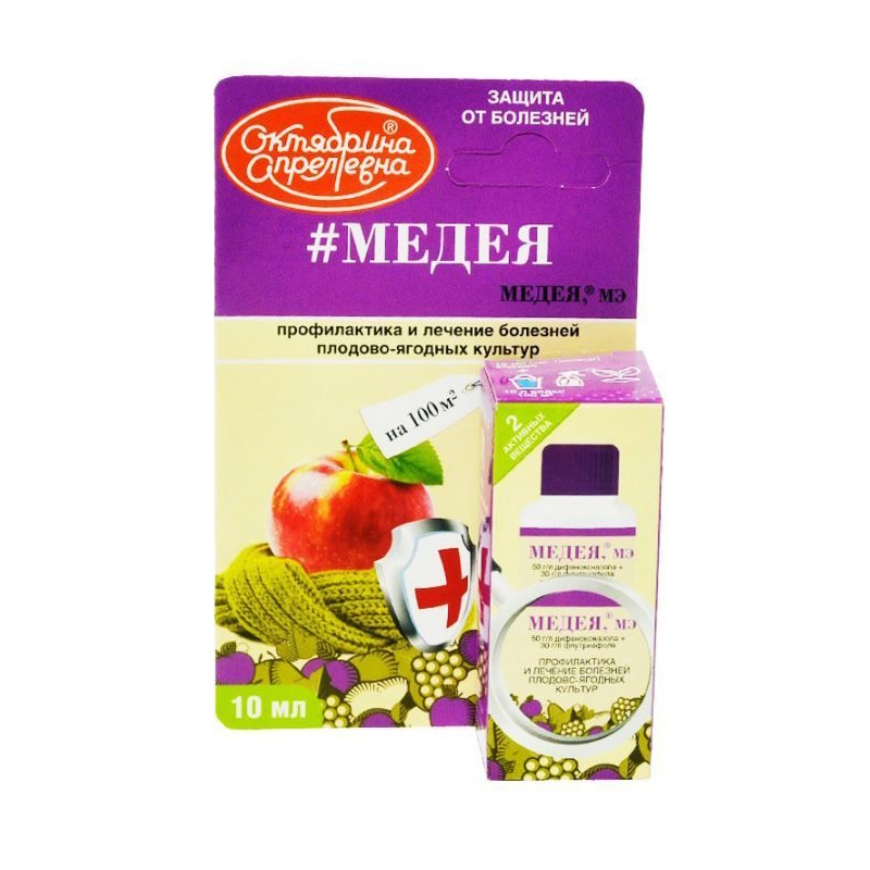 Применяется для лечения и профилактики плодово-ягодных культур от всех болезней (парша, пятнистость листьев, гниль плодов и др. ). Преимущества: быстро и продолжительно действует при любой погоде; экономично расходуется и не выпадает в осадок; безопасен для культуры. Продлевает сроки хранения. Действие: Препарат проявляет защитное и лечебное действие, быстро проникает в листья, предотвращает заражение и останавливает развитие заболевания на любой стадии его развития. Рекомендации по применению: При благоприятных условиях для развития заболеваний рекомендуется профилактическая обработка, не дожидаясь первых признаков. Последующие обработки проводятся через 7-10 дней в зависимости от погодных условий и риска потенциального заражения. Рекомендуется не более 3-4 обработок препаратом за сезон. С целью исключения привыкания к препарату возбудителей болезней рекомендуется чередование обработок препаратами из разных химических групп с разными механизмами действия. Полезно знать: Благодаря своей препаративной форме – микроэмульсия – Медея мягко действует на культуру, не повреждая ее, не вызывая ожогов на листьях и сеточки на плодах, но эффективно борется с различными заболеваниями, а также продлевает сроки хранения продукции. Важно только, чтобы от обработки препаратом до сбора урожая прошло не менее 28 дней.