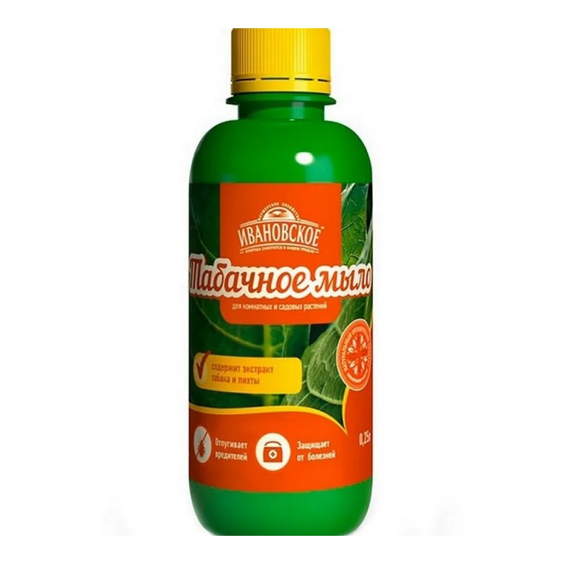Табачное мыло от Фермерского хозяйства Ивановское — натуральное средство для защиты комнатных и садовых растений от насекомых-вредителей и болезней. Содержит экстракт табака, губительный для тли, трипсов, паутинного клеща, слюнявки-пенницы и других сосущих паразитов. Обогащено пихтовой вытяжкой, которая укрепляет иммунитет растений, повышает их устойчивость к заболеваниям, стимулирует плодообразование и ускоряет усвоение питательных веществ. Эффективно против бурой пятнистости, мучнистой росы, ржавчины и фитофтороза. Концентрат объёмом 0,25 л легко разводится в воде для опрыскивания. Безопасно для растений при соблюдении инструкции, не теряет свойств после размораживания. Подходит для использования в саду и дома.
