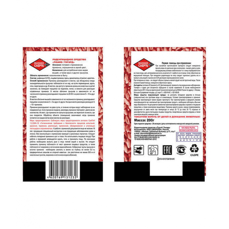 Приманка зерновая Мышиная Смерть №1 — эффективный родентицид для борьбы с мышами и другими грызунами в помещениях и на садовых участках. Действующее вещество дифенацин (0.015%) вызывает у грызунов внутренние кровотечения, приводя к их гибели. Зерновая основа привлекает вредителей благодаря естественному запаху и вкусу, что повышает вероятность поедания отравы. Препарат выпускается в удобной форме зерен, готовых к применению. Подходит для использования в жилых домах, подсобных помещениях, дачах, складах и других объектах, где требуется защита от грызунов. Вес упаковки — 200 грамм. Произведено в России компанией «Оборона» под брендом TIGARD. Перед применением рекомендуется ознакомиться с инструкцией и соблюдать меры безопасности.