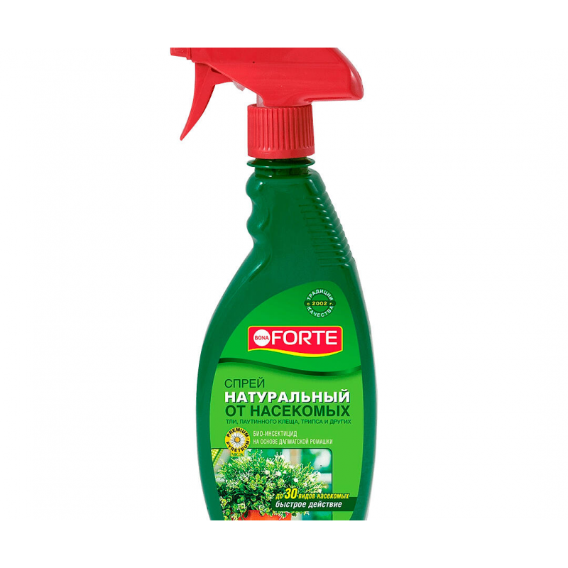 Спрей BONA FORTE — эффективное средство для моментального уничтожения летающих насекомых-вредителей на комнатных и декоративных растениях открытого грунта. Благодаря натуральному составу на основе пиретрума, спрей оказывает быстрое парализующее действие с эффектом «нокдауна», не вызывая привыкания у насекомых. После обработки действующие вещества быстро разлаются до экологически безопасных остатков, что делает средство безвредным для человека и окружающей среды. Экономичный расход и удобная форма выпуска в виде спрея обеспечивают простоту применения. Продукт производится в России компанией АО «Русинхим» и поставляется во флаконе объёмом 500 мл.