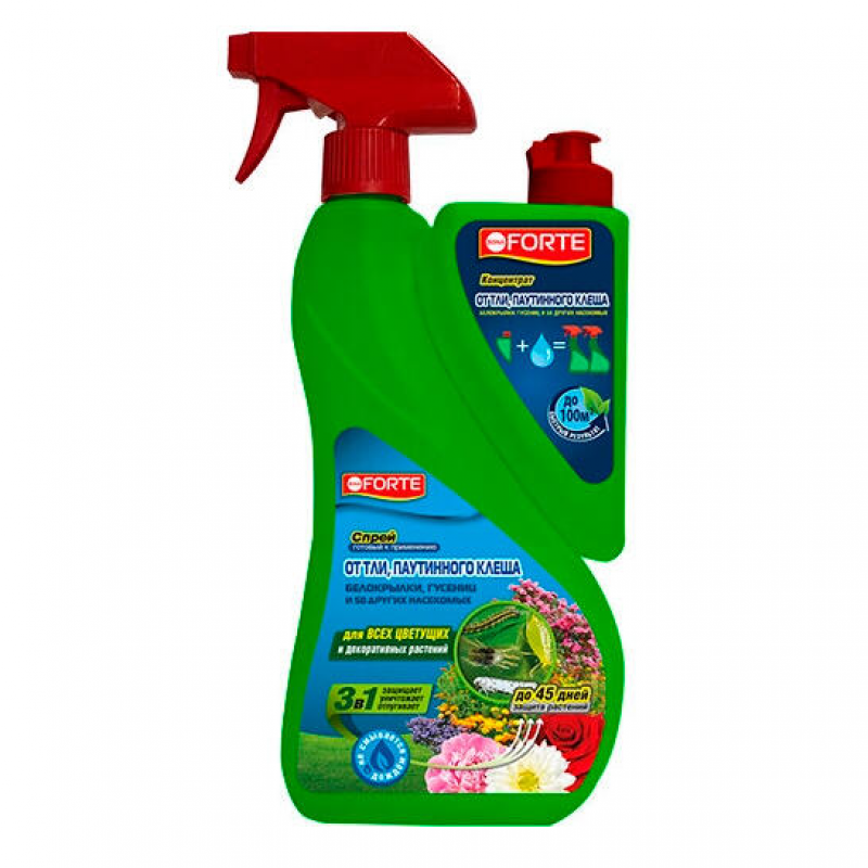 Спрей и концентрат BONA FORTE — это универсальное средство для защиты растений от 50 видов насекомых-вредителей, включая тлю, паутинного клеща, белокрылку, трипсов, гусениц и колорадского жука. Оно обеспечивает тройное действие: мгновенно уничтожает вредителей, создаёт долговременный барьер защиты до 45 дней и обладает отпугивающими свойствами. Средство устойчиво к смыванию дождём и эффективно при любой погоде. Спрей удобен для обработки небольших растений, а концентрат — для больших площадей садового участка. Подходит для борьбы с летающими и ползающими насекомыми, гарантируя надёжную защиту вашего урожая.