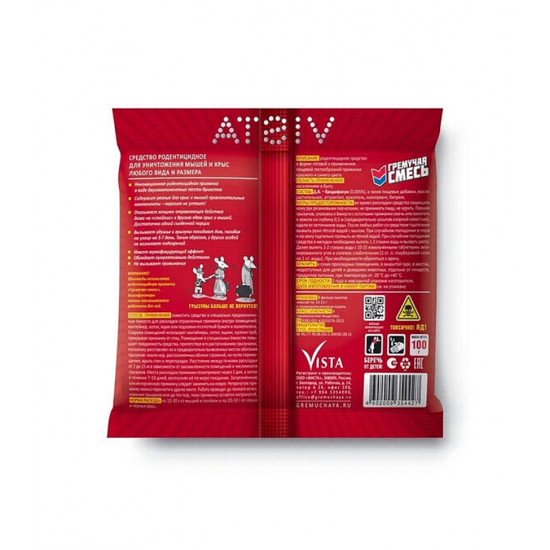 Тесто-Брикет 'Гремучая смесь' — эффективный родентицид для уничтожения крыс и мышей в помещениях. Средство выпускается в форме удобных тесто-брикетов с действующим веществом бродифакум (0,005%), обеспечивающим быстрый и надежный результат. Подходит для использования в жилых, складских, производственных и других закрытых пространствах. Продукт отличается простотой применения и высокой привлекательностью для грызунов благодаря специальной рецептуре. Вес упаковки — 100 г. Произведено в России. Перед покупкой рекомендуется уточнять актуальные характеристики, наличие и стоимость в конкретном магазине, так как внешний вид и детали могут варьироваться.