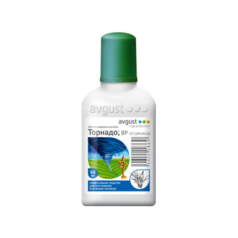 Торнадо - универсальный гербицид сплошного действия. Гербицид применяется для уничтожения более 150 видов сорной растительности. Устоять против мощного гербицида сплошного действия не смогут ползучий пырей, бодяк, амброзия, свинорой, вьюнок, кустарники, древесная поросль и др. Благодаря уникальной проникающей способности с листьев обработанных растений «Торнадо» попадает во все органы растений и вместе с ним поступает в корни, угнетая все процессы жизнедеятельности сорняков. В течение нескольких дней желтеют листья, а позже наступает гибель растений: травянистых – через пару недель, кустов и древесной поросли – не более чем через 2 месяца. Семена не пострадают, поскольку препарат в почве неактивен. Решив купить «Торнадо», вы сможете выполнить самые разные операции:подготовить почву на полях и в огороде к посеву – обычно препарат вносят за три недели до вспашки или перекопки, осенью или весной зачистить территорию под застройку от деревьев и кустов уничтожить травянистые сорняки на полях с уже высаженным картофелем – за 2–5 дней до того, как появятся всходы культуры удалить траву в неудобных местах: между тротуарной плиткой, на дорожках, засыпанных гравием или галькой взрыхлить землю – после отмирания корней крупных сорных растений остаются полости, обеспечивающие дыхание почвы и впитывание лишней влаги обработать приствольные круги плодовых деревьев при условии защиты стволов деревьев. Правила применения: Нужное количество препарата разводят в 3 литрах воды и обрабатывают площадь в 100 м2. Работы выполняют в безветренную сухую погоду, утром или вечером (оптимально – до 10:00 или после 18:00). Раствор используют за один раз, поскольку при хранении он теряет свои свойства. Важно защищать культурные растения от попадания препарата пленкой или фанерой.