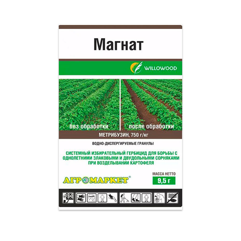 Магнат Willowood — это высокоэффективный почвенный гербицид для защиты картофеля, содержащий максимальную концентрацию метрибузина (750 г/кг). Он действует как ингибитор фотосинтеза, поглощаясь преимущественно через корневую систему, но также способен проникать через листья. Препарат обеспечивает широкий спектр действия против однолетних двудольных и злаковых сорняков, включая просо куриное, метлицу, щетинник, щирицу, василек, марь белую, ромашку, горцы и пикульник. Благодаря созданию устойчивого почвенного экрана, он гарантирует длительную защиту от новых всходов сорных растений на срок от 1 до 2 месяцев, в зависимости от почвенно-климатических условий. Форма выпуска — удобные гранулы для применения в открытом грунте.