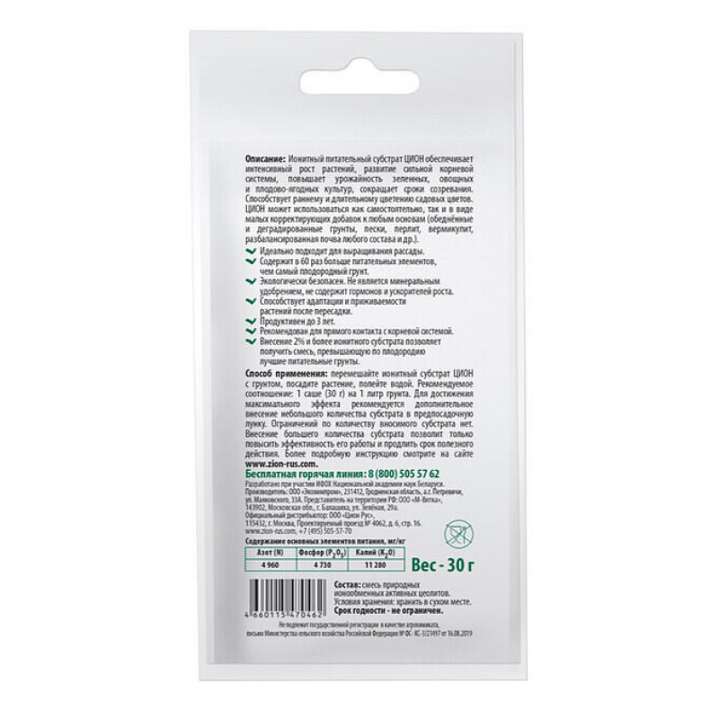 Субстрат питательный Цион Классик — это универсальное минеральное удобрение в гранулах, предназначенное для всех видов растений открытого грунта. Оно содержит сбалансированную смесь природных углеродных материалов и активных цеолитов, обеспечивающую растения основными питательными элементами: азотом (4960 мг/кг), фосфором (4730 мг/кг) и калием (11280 мг/кг). Препарат способствует интенсивному росту культур, развитию мощной корневой системы и повышению урожайности зелени, овощей и плодово-ягодных растений. Подходит для использования на любых типах грунта, гарантируя эффективное питание и устойчивость растений. Произведено в Беларуси брендом ZION, фасовка — 30 г.